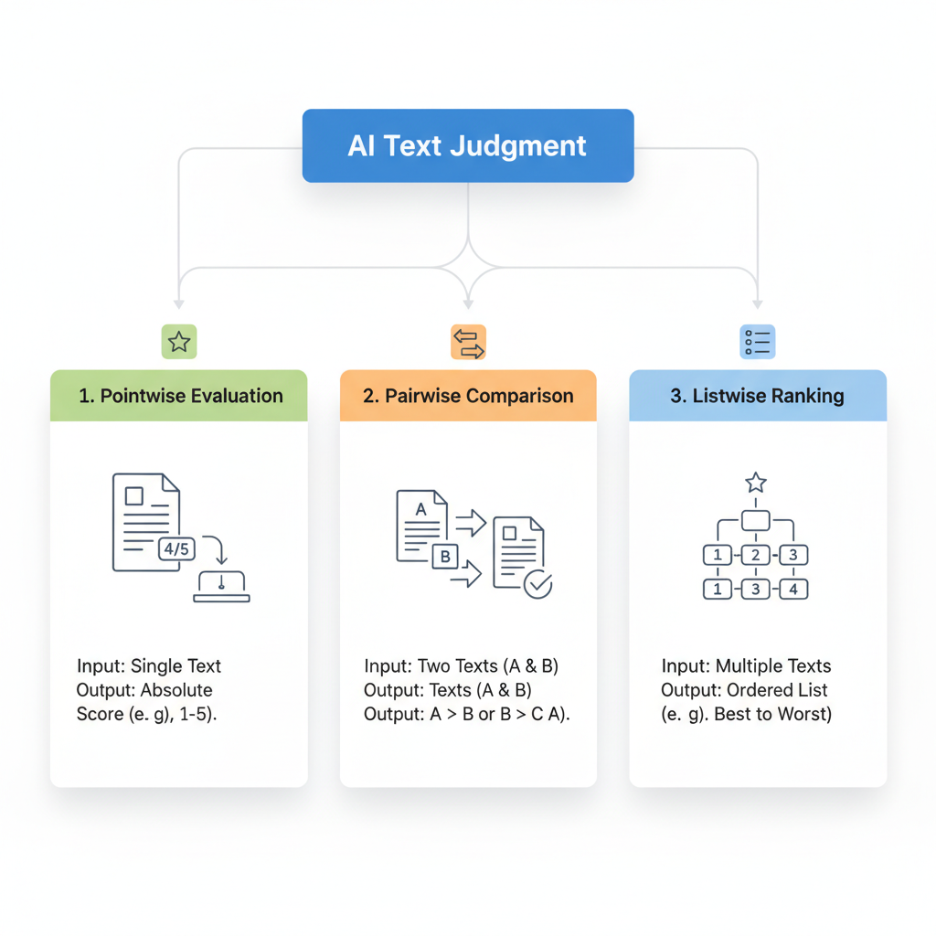 1. Pointwise Evaluation (Individual Scoring) This is like asking a teacher to grade each essay independently on a scale from 1 to 5. The AI looks at one piece of text at a time and assigns it a score based on specific criteria.